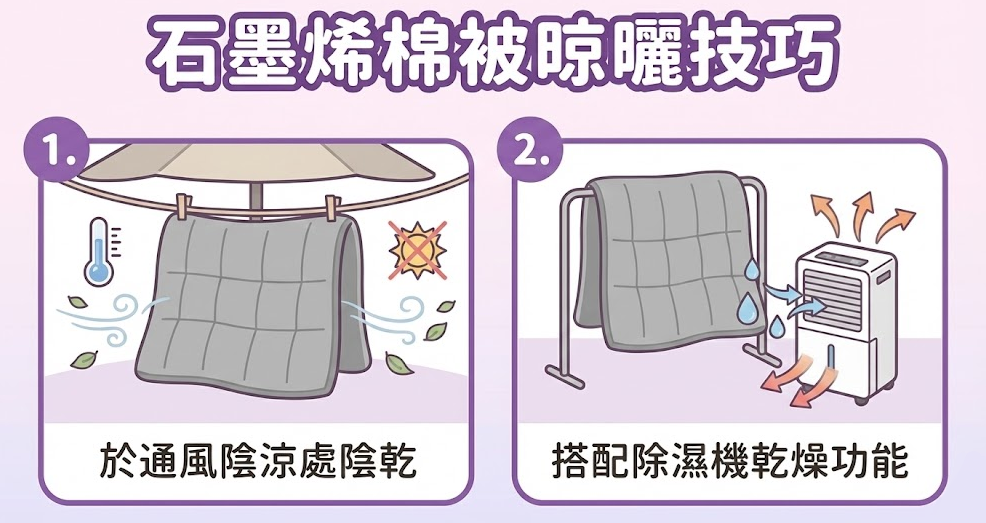 一般建議石墨烯棉被在洗好後,平鋪於通風的乾燥陰涼處晾乾即可,避免放置於豔陽下長時間曝曬,以免高溫破壞其功能。